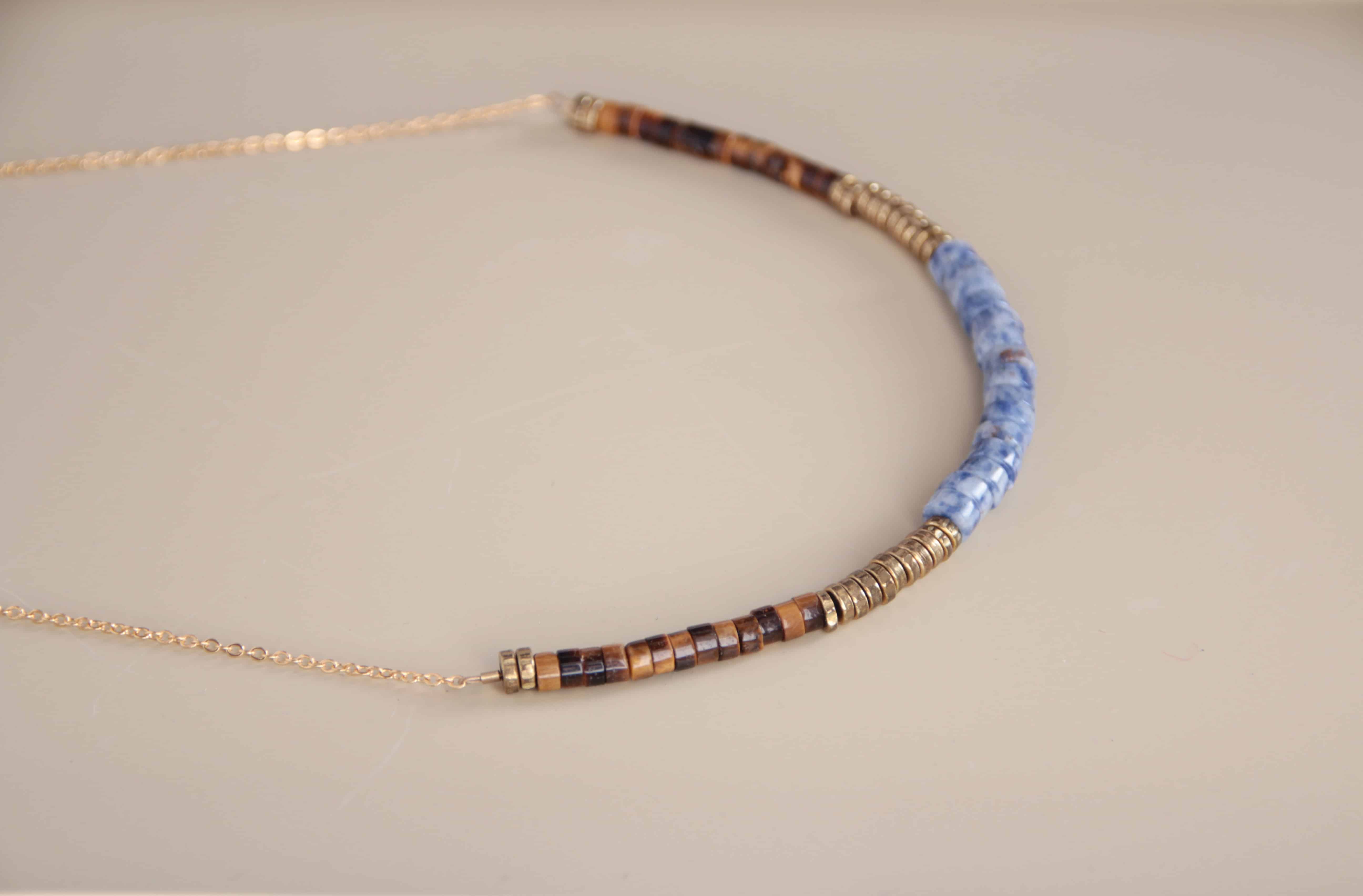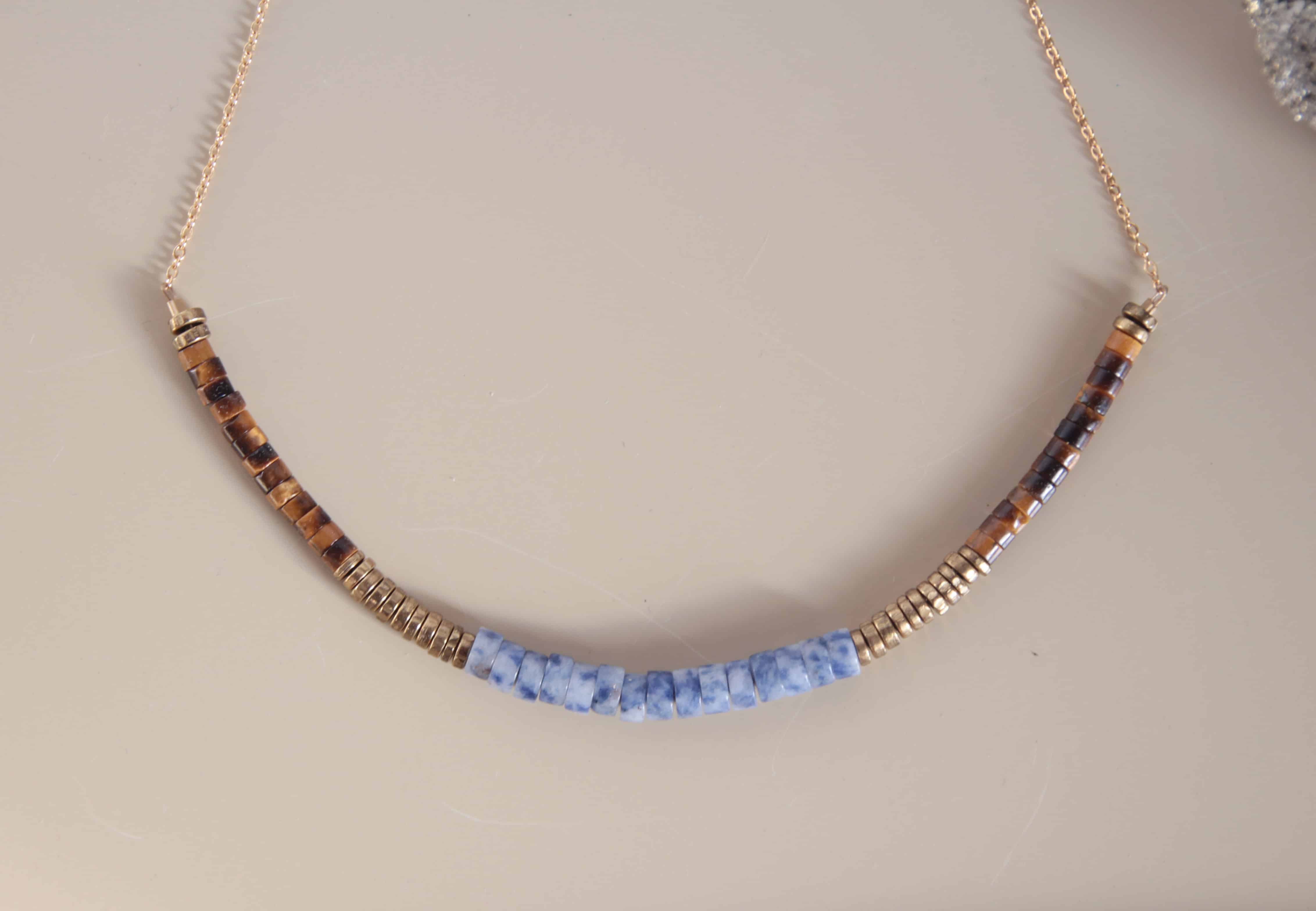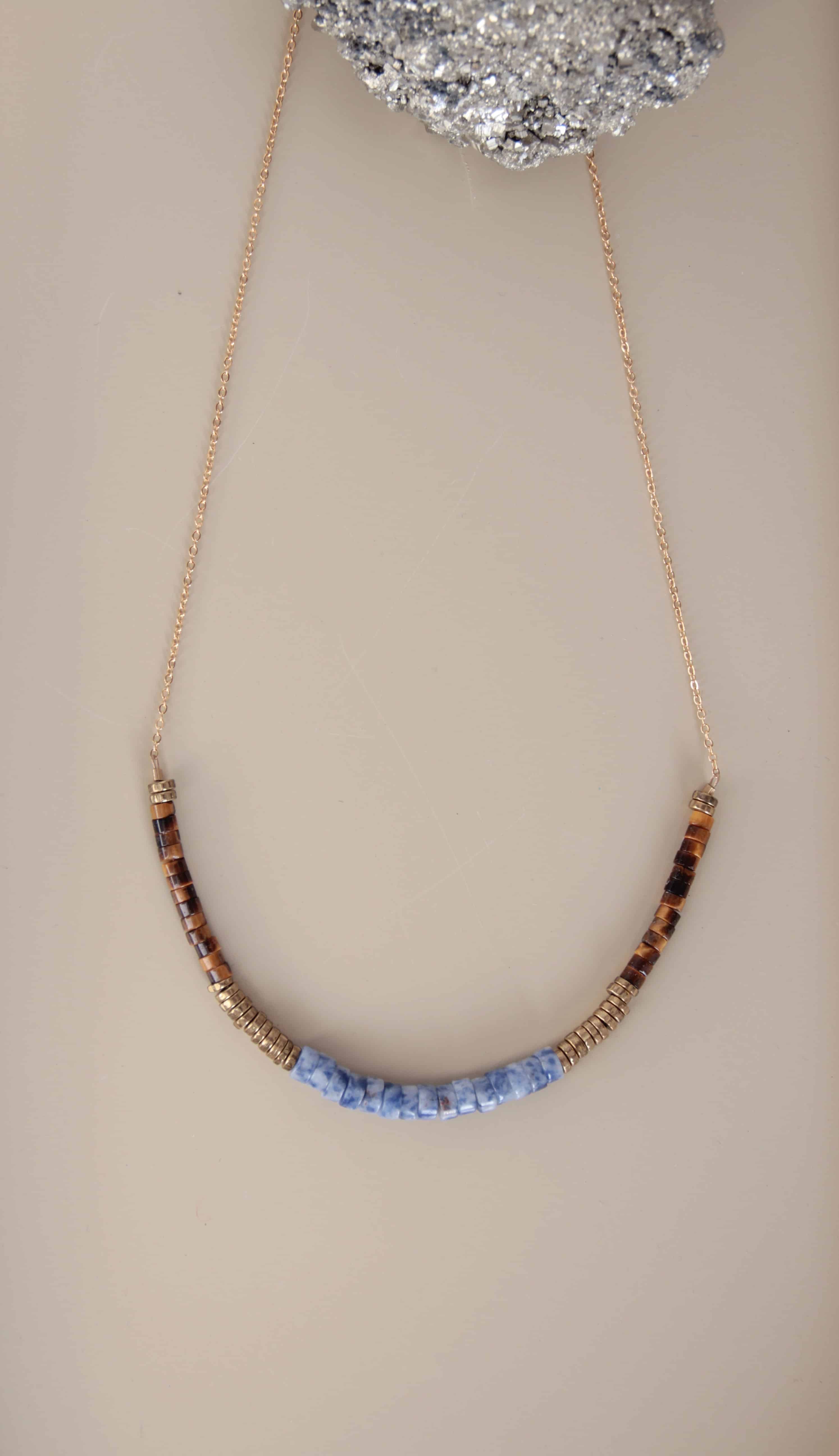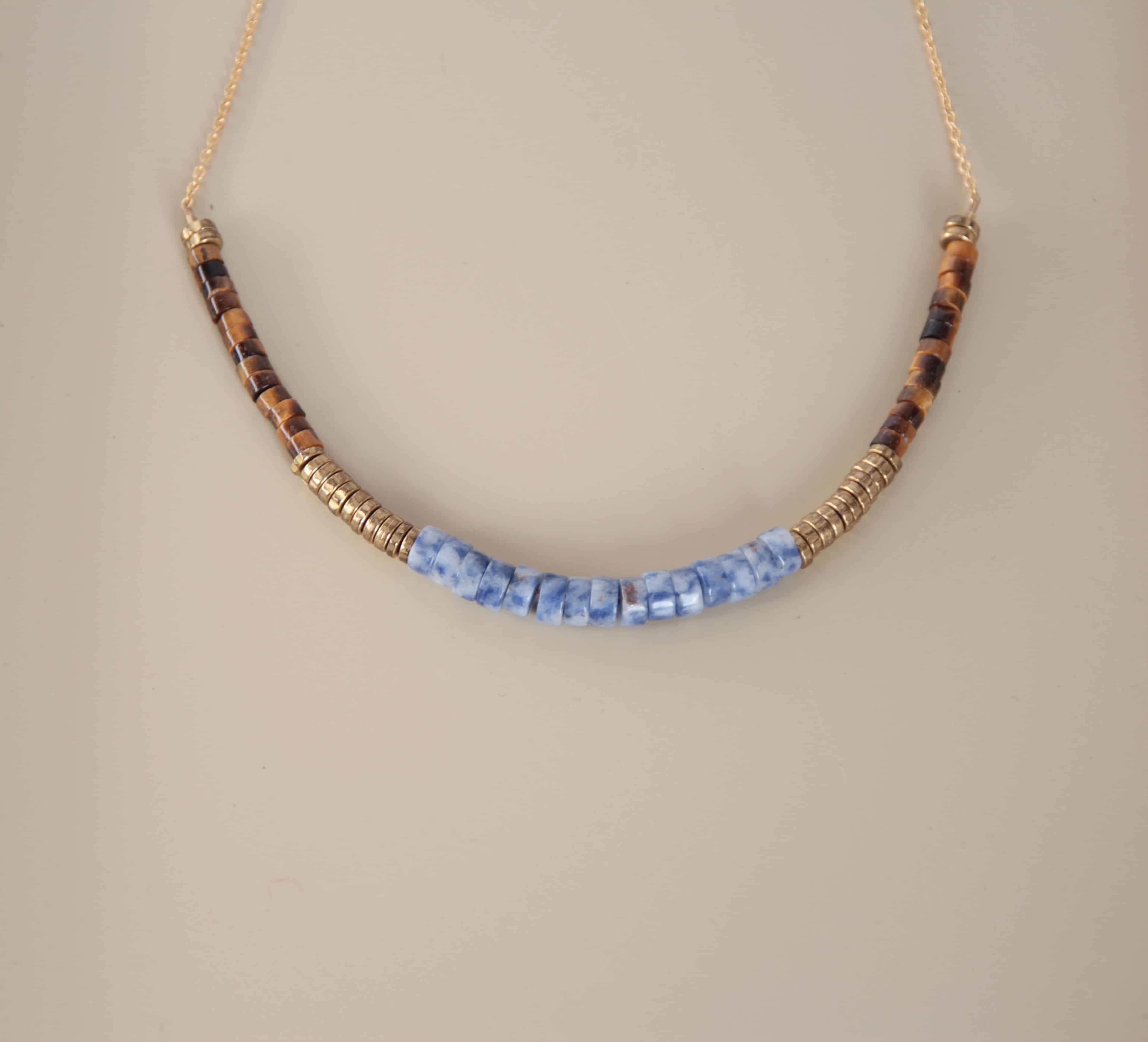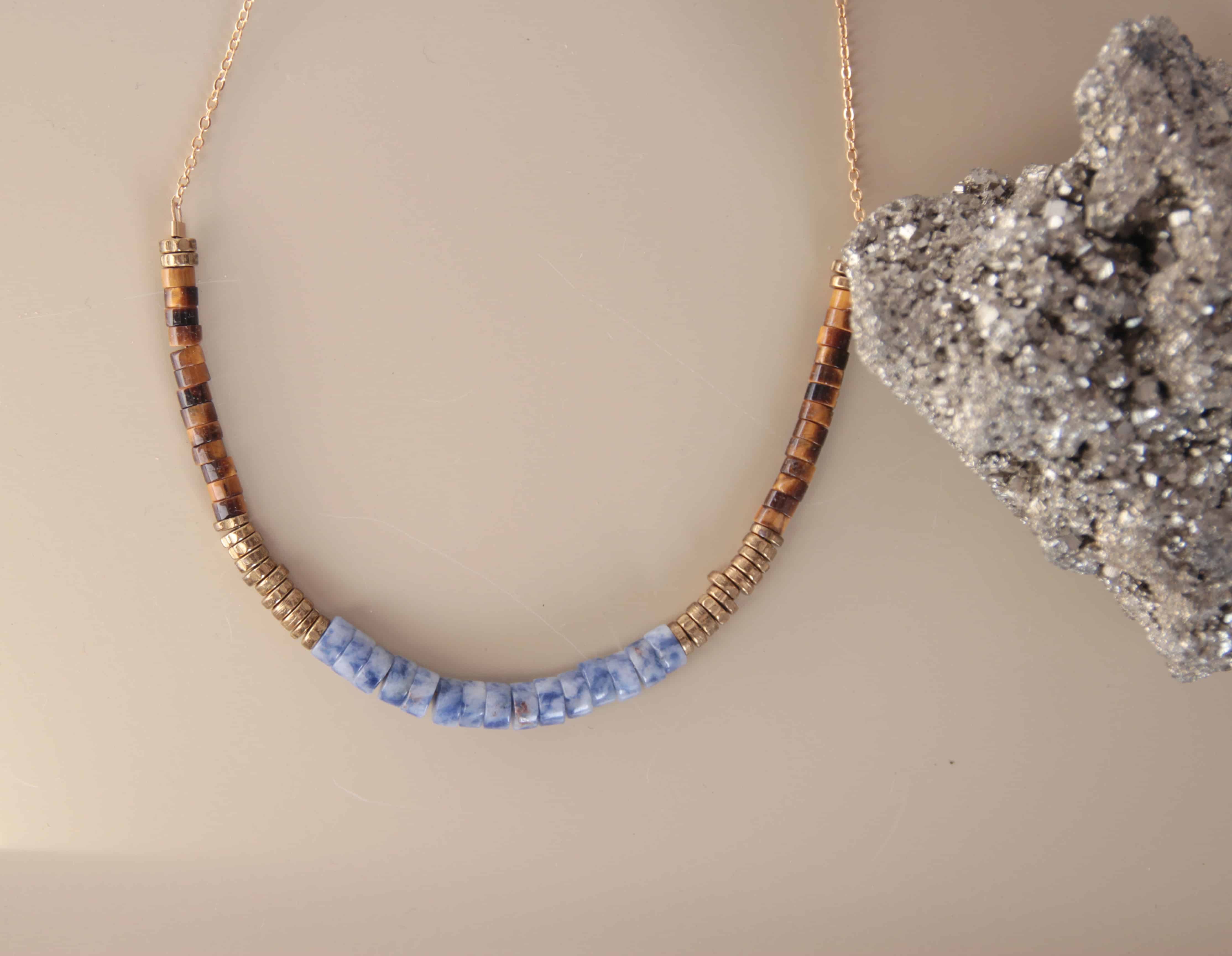 Ce collier court aux tons bleu de la Sodalite et marron de l’Oeil de Tigre est très joli à porter !