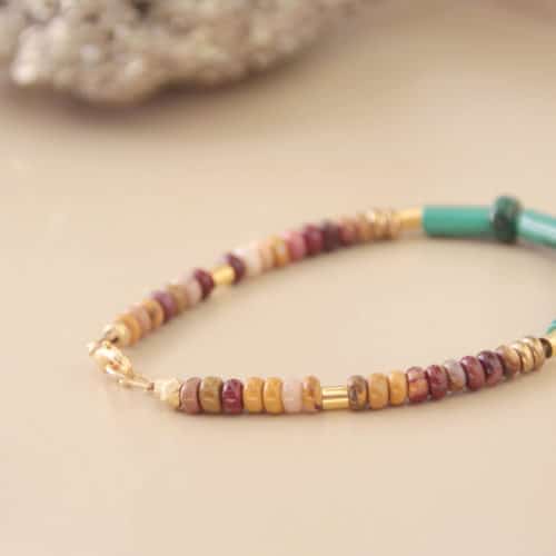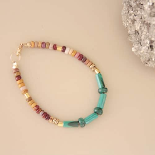 Bracelet au style graphique avec des pierres fines aux tons bordeaux en Tourmaline, du nacre blanc, une touche de vert olive avec des pierres en Serpentine et du gris avec des pierres en Pyrite.